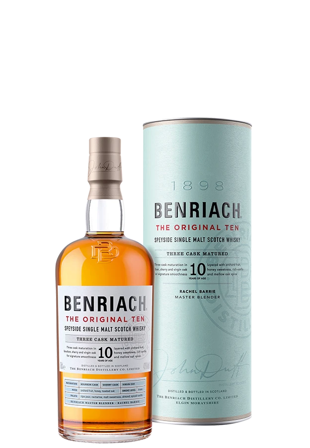 Benriach ist der Nonkonformist unter den Speyside Destillerien. Das stellt auch der Benriach The Original Ten unter Beweis, der die Türe zu den ungetorften Single Malts der Brennereien öffnet. Weiteres Merkmal des 10 Jahre gereiften Speyside Whiskys ist die außergewöhnliche Reife, für die gleich drei unterschiedliche Fasstypen verwendet werden. Die Reife in ehemaligen Bourbon-Fässern, Ex-Sherry Casks und neuen Eichenfässern, den Virgin-Oak Casks, erfolgt allerdings parallel. Es handelt sich folglich nicht um ein besonderes Finishing im klassischen Sinne. Die genaue Verteilung auf die Fässer während der zehnjährigen Reife gibt die Distillery jedoch nicht preis. Verantwortlich für das goldfarbene Kunstwerk ist Master Blenderin Rachel Barrie.
