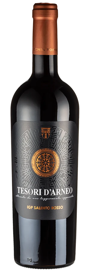 Die Hochebene Terra D’Arneo umfasst neun Gemeinden auf der apulischen Halbinsel Salento. Hier finden sich verträumte Dörfer und eine bezaubernde Landschaft, die von Olivenhainen und Weinbergen geprägt ist. Wer diese Gegend einmal besucht hat, versteht sofort, warum dieser Wein „Tesori D’Arneo“ – die Schätze von Arneo – heißt. Die Cuvée aus 80 Prozent Negroamaro und 20 Prozent Malavsia Nera huldigt der süditalienischen Gegend mit einem ganz typischen, sehr charaktervollen Rotwein.